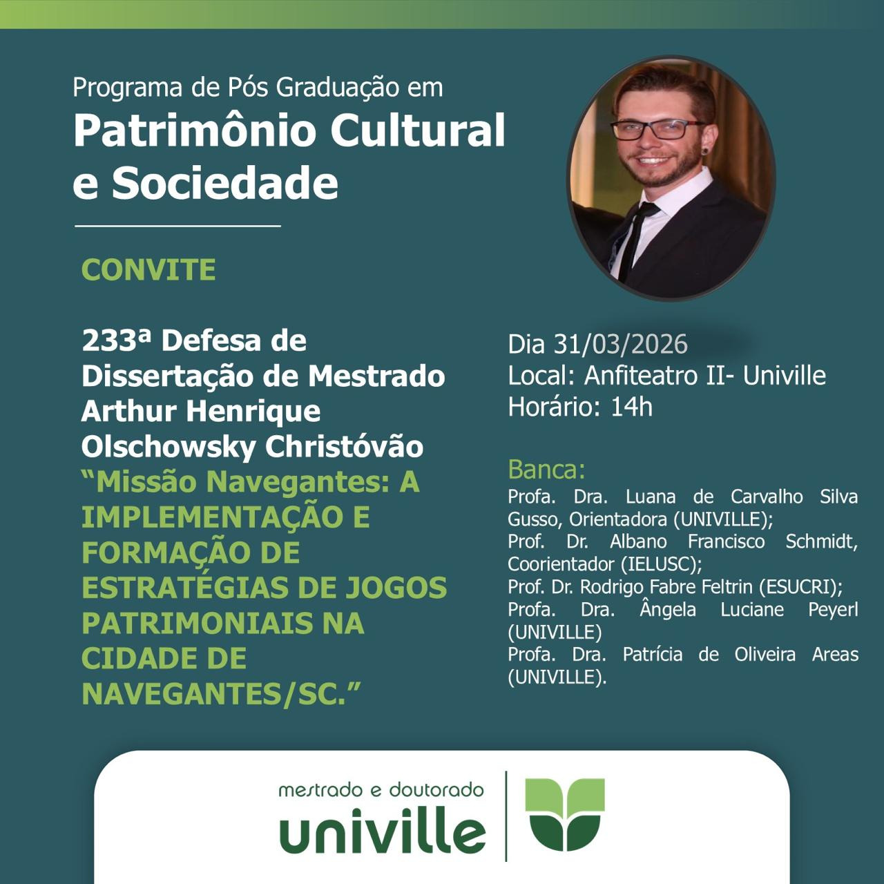 Ao final da 233ª Defesa de Dissertação de Mestrado, Arthur Henrique Olschowsky Christóvão foi aprovado com a dissertação “Missão Navegantes: A implementação e formação de estratégias de jogos patrimoniais na cidade de Navegantes/SC”, recebendo o título de mestre em Patrimônio Cultural e Sociedade pela Univille.